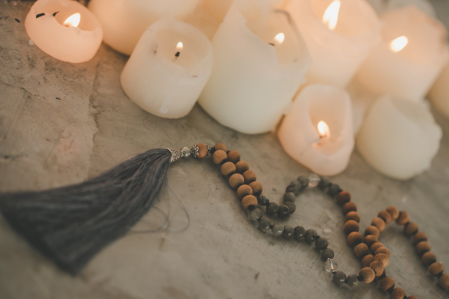 The mala is decorated with a lilac tassel and a small silver Buddha head. It features 108 individually knotted beads, following traditional mala design used for meditation and mindful moments.