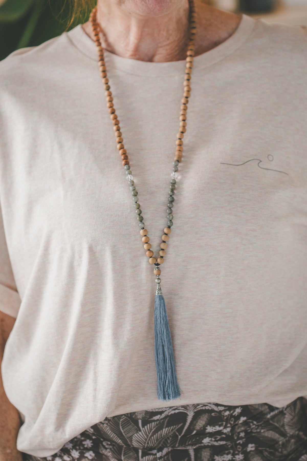 Beautiful mala necklace made with sandalwood, labradorite and quartz, both grounding and full of subtle energy. With its natural wood tones and soft shimmering stones, it is easy to wear and connects you to your inner balance.