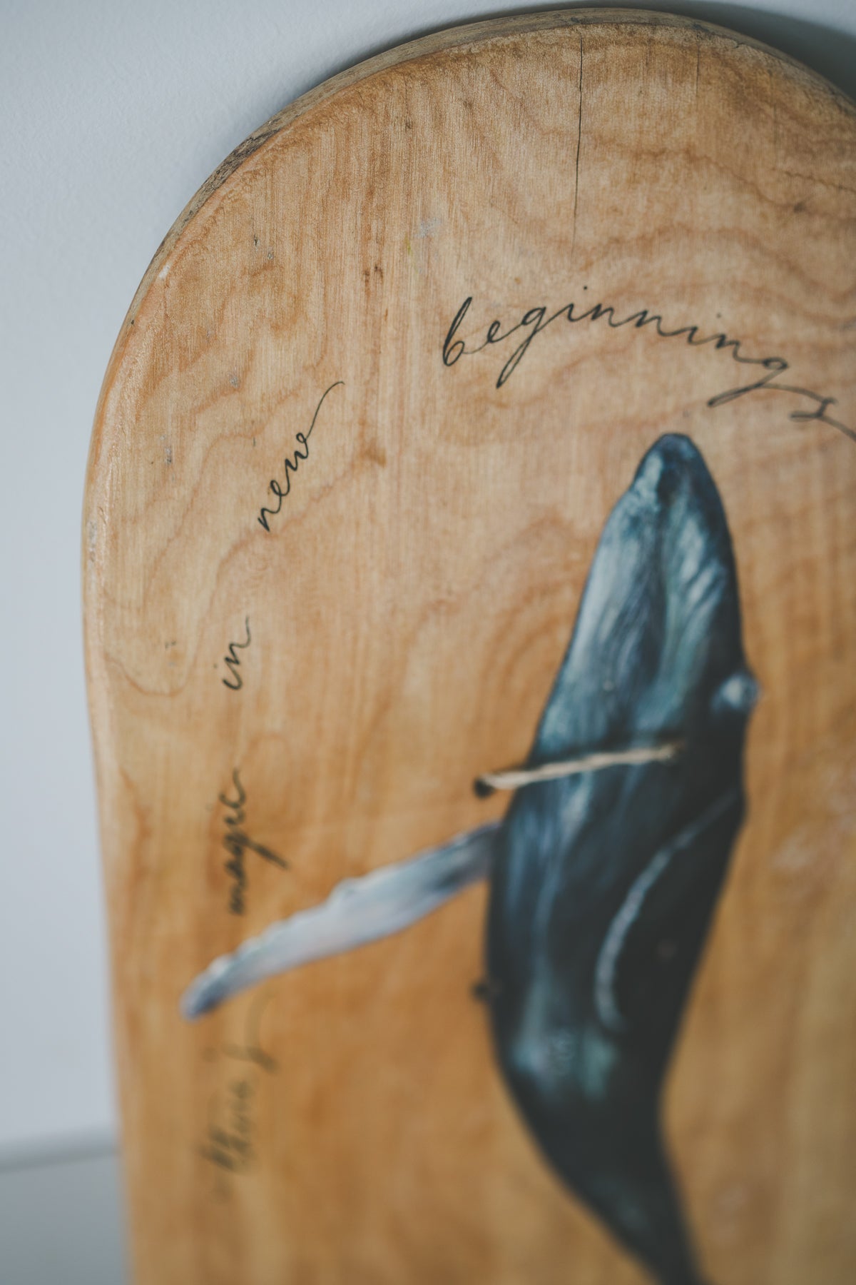 A unique, one-of-a-kind artwork painted on a reclaimed piece of skateboard by Marietta Kleinod.