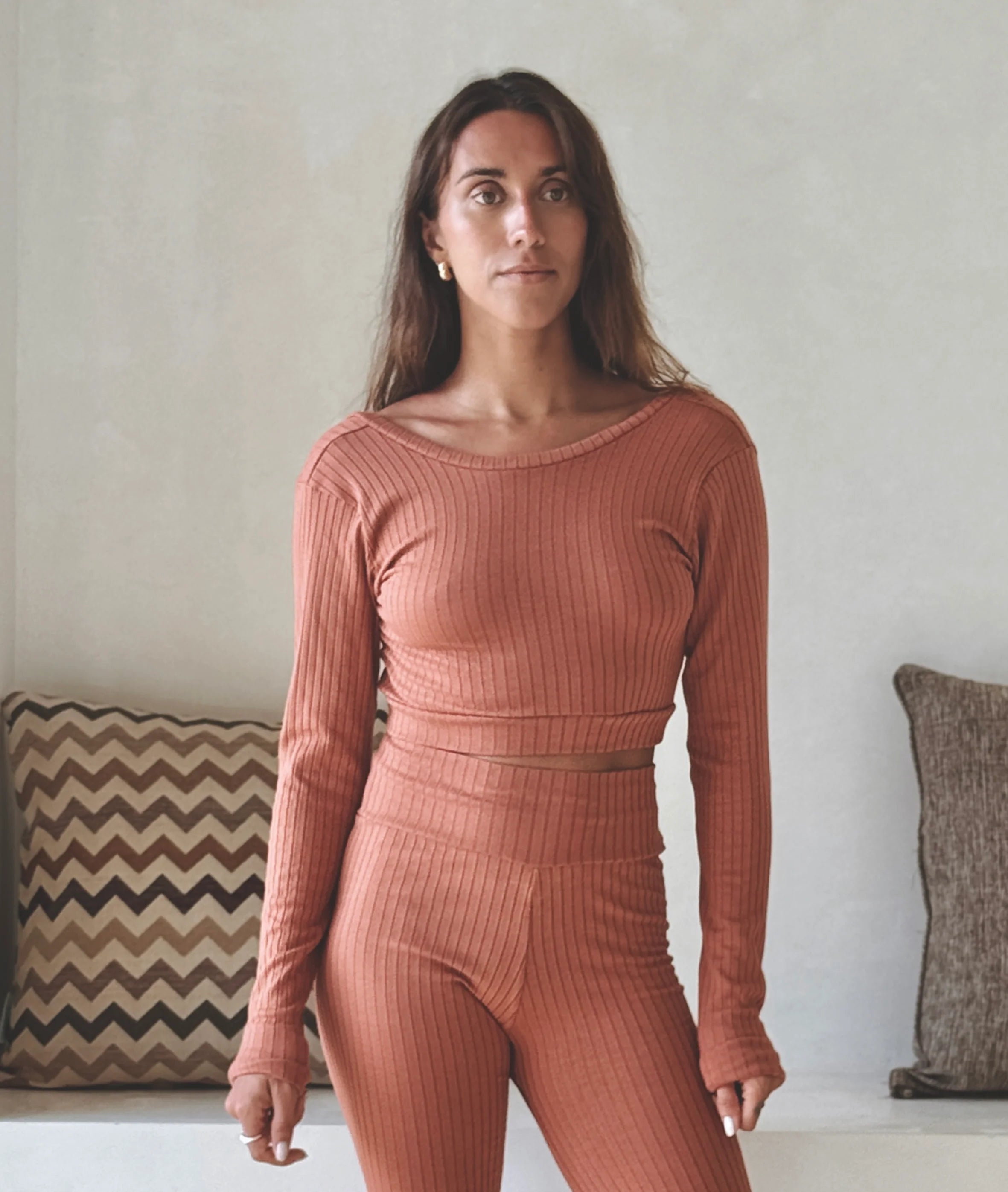 The basic long sleeve top that you need, with a beautiful open back that offers comfort and support on and off your yoga mat. Made with Ecovero ™ fabric that’s super soft and moves with you & a beautiful ribbed design. You can match it with Ribbed Flair Pants/Leggings.