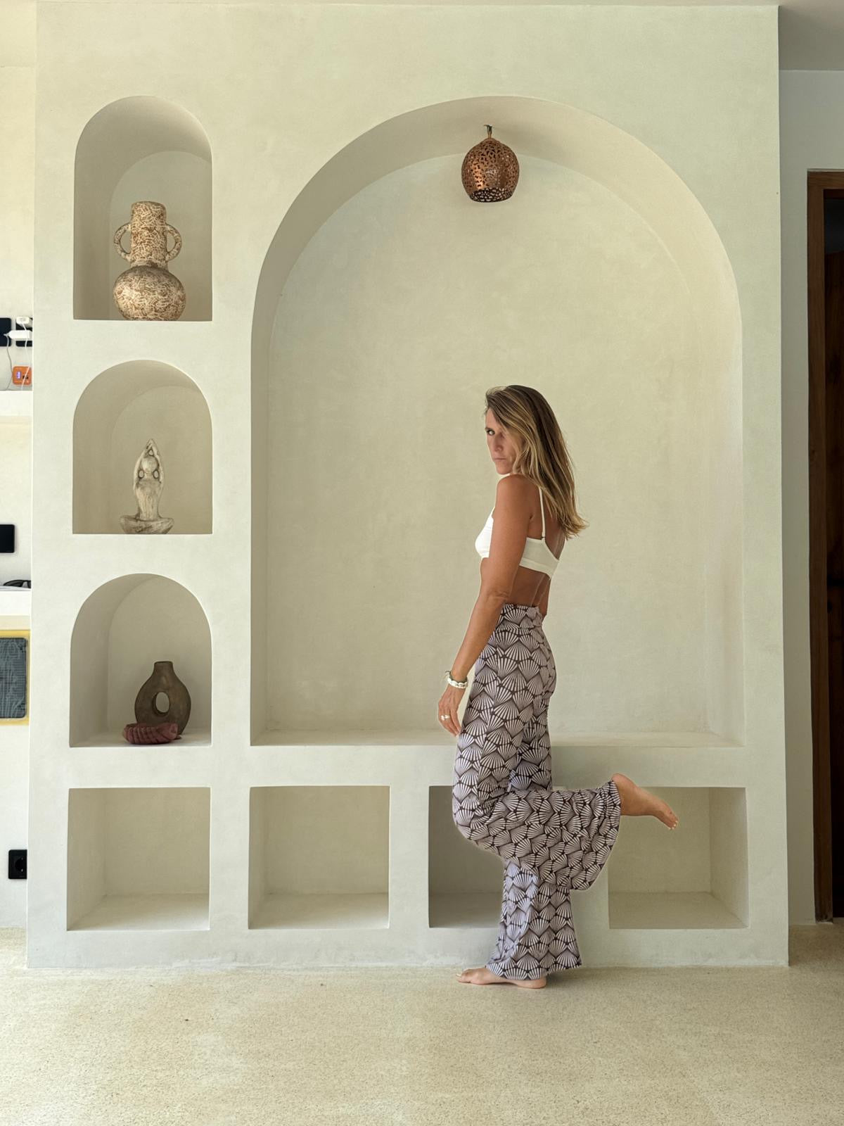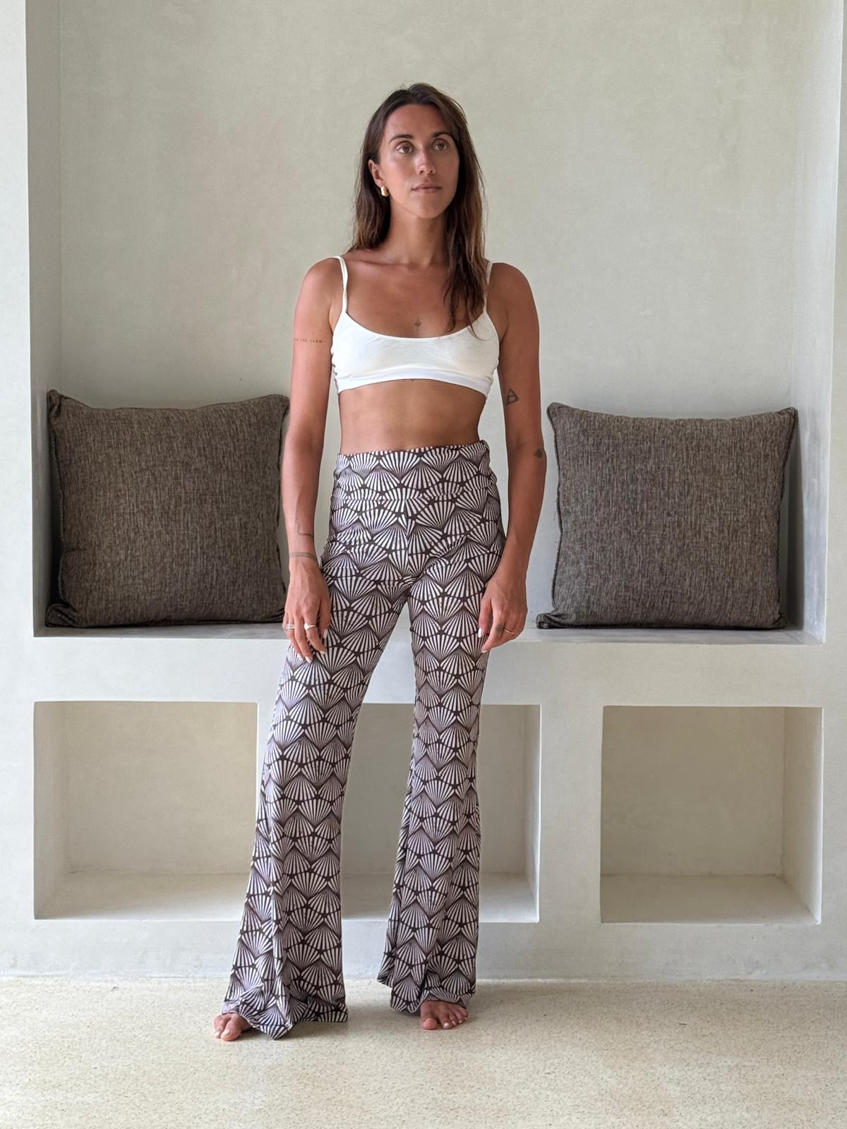 New flattering cut of flair pants now with the print of dark shell is giving you this flow island living vibes.