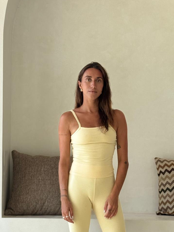Move with ease and confidence in our basic top – a breathable Top, designed for soft support and freedom of movement. With a beautiful open back that offers comfort and support on and off your yoga matCrafted. In our new pastel Yellow color, for our delicate marmaids over there...
